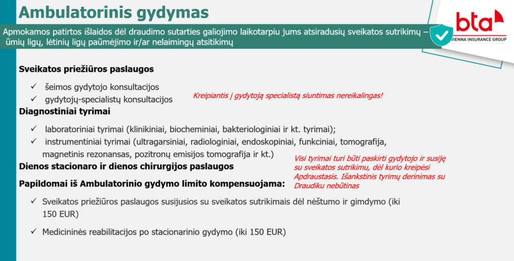 Pagal BTA draudiko taisykles Nr. 52.3 Visos medicinos paslaugos, papildomas paslaugų paketas apima šiuos punktus: