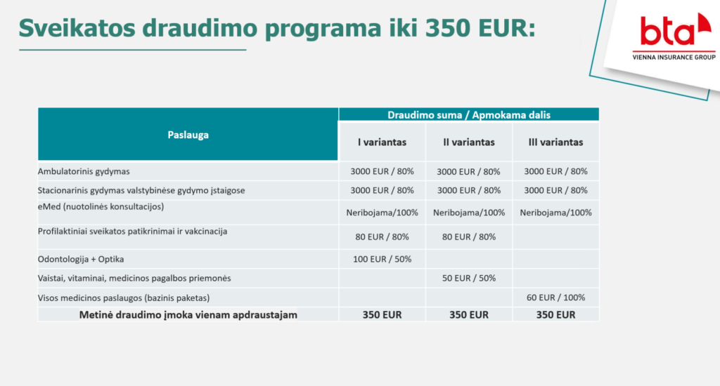 | Papildomų paslaugų paketas | 1. Sveikatinimo paslaugos 2. Higienos priemonės ir gydomoji kosmetika, įsigyta vaistinėse 3. Saulės akiniai, apsauginiai akiniai |