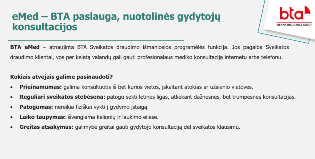 BTA eMed – atnaujinta BTA Sveikatos draudimo išmaniosios programėlės funkcija. Jos pagalba Sveikatos draudimo klientai, savo paslaugų krepšelyje turintys Ambulatorinio gydymo paslaugų programą, vos per keletą valandų gali gauti profesionalaus mediko konsultaciją internetu arba telefonu.